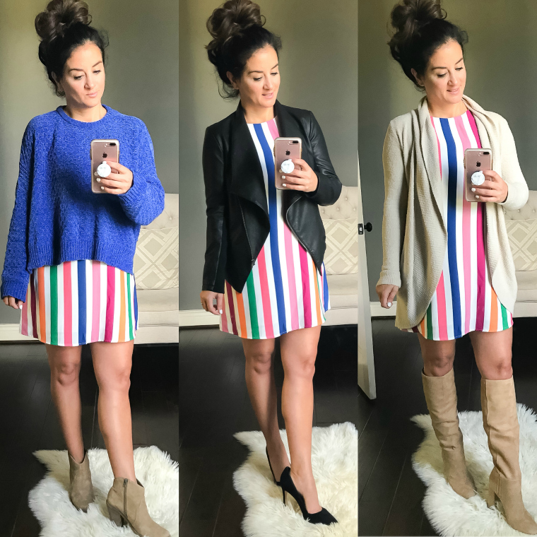 For this post, I am going to use this fun bright vertical stripe dress that I got last year from Ruth Grace Boutique. It’s sleeveless and is flattering on almost every body type. Here are simple examples on ways you can transition this dress into fall with 3 different looks.